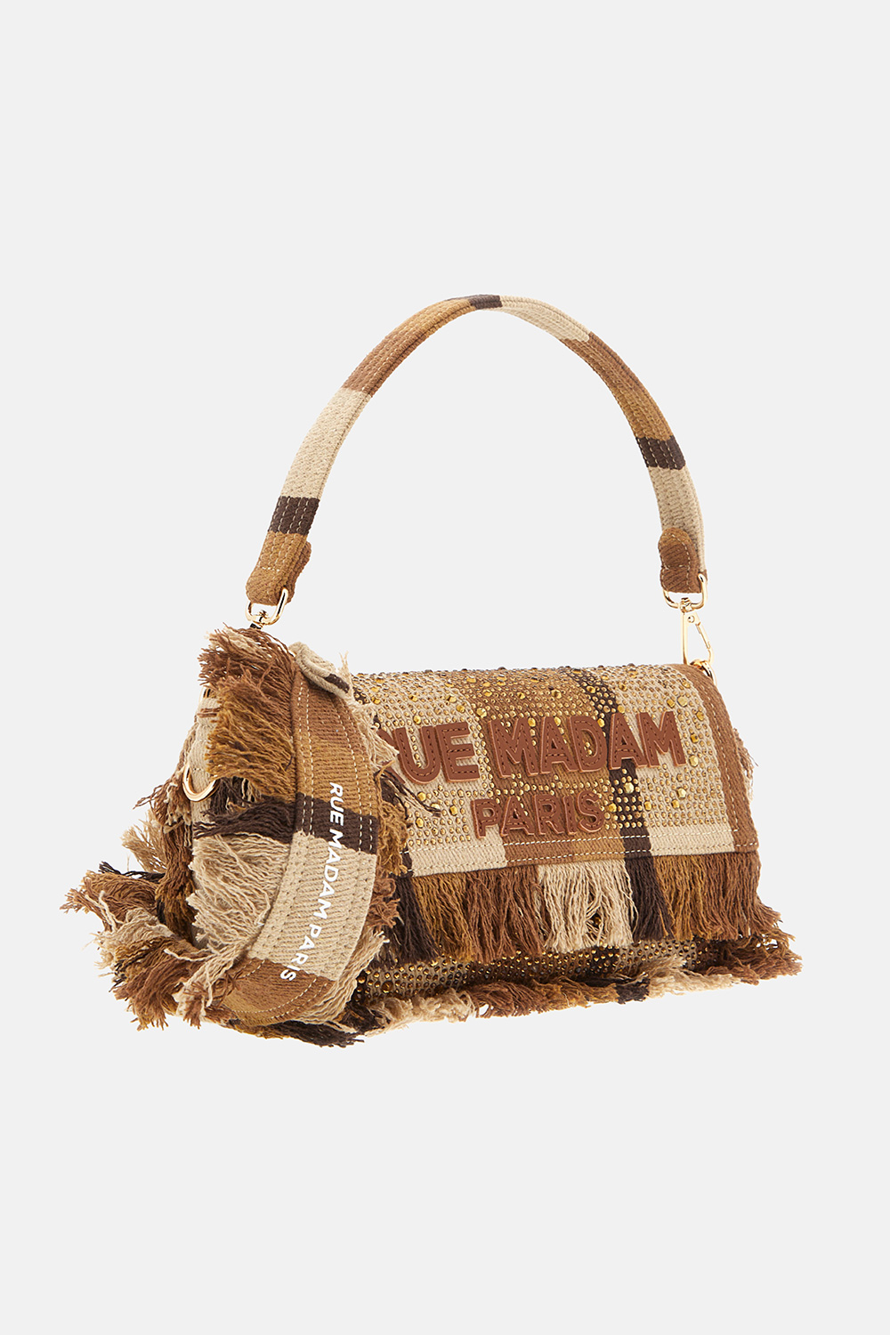 Shoulder bag in canvas with a bold and refined character, embellished with fringes and rhinestone applications that add personality to the design. The logo and handles in vegan leather lend an elegant and contemporary touch. Equipped with both a removable handle and shoulder strap featuring fringe details, it offers a versatile and distinctive style. The interior is finished with a cotton lining and pocket, ideal for practical organization of everyday essentials. Dimensions L 25 x H 15 x W 7 cm