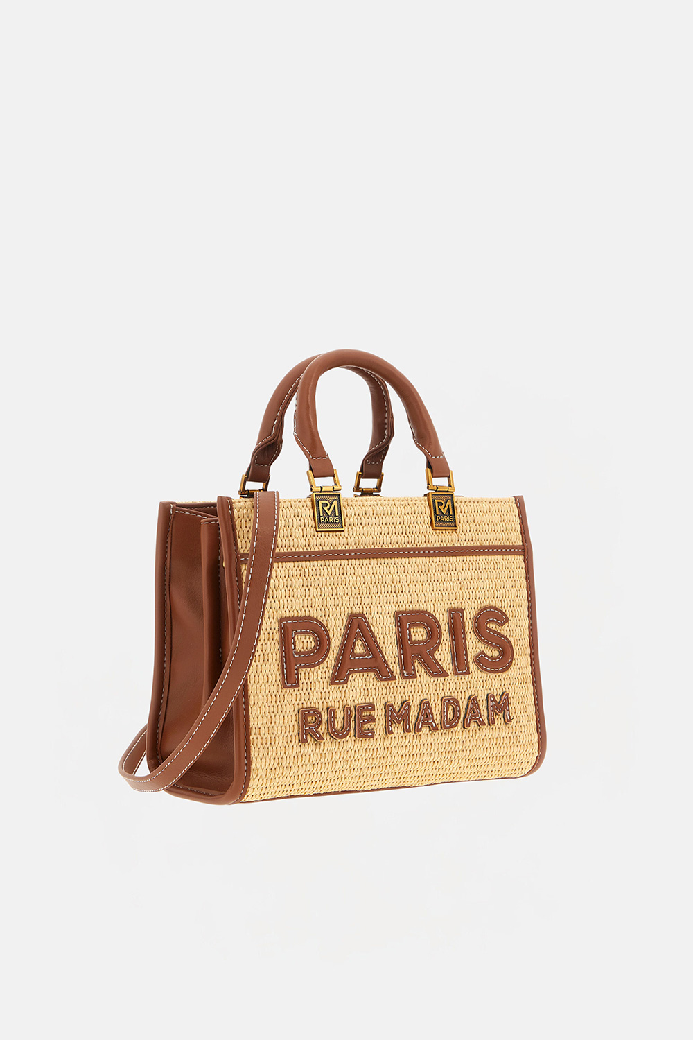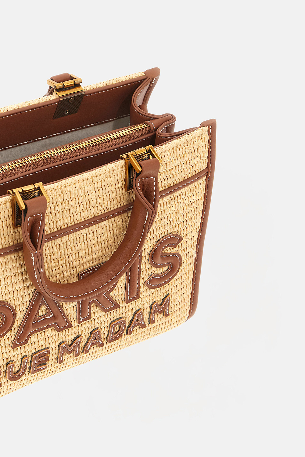 Mini tote bag in straw with eco-leather sides and details, featuring the padded PARIS logo with contrasting stitching. Eco-leather handles with metallic logo details in aged gold galvanic finish, removable shoulder strap, central eco-leather pocket with zip, and cotton lining with an internal pocket. Dimensions: L 23 cm × H 18 cm × D 10 cm.