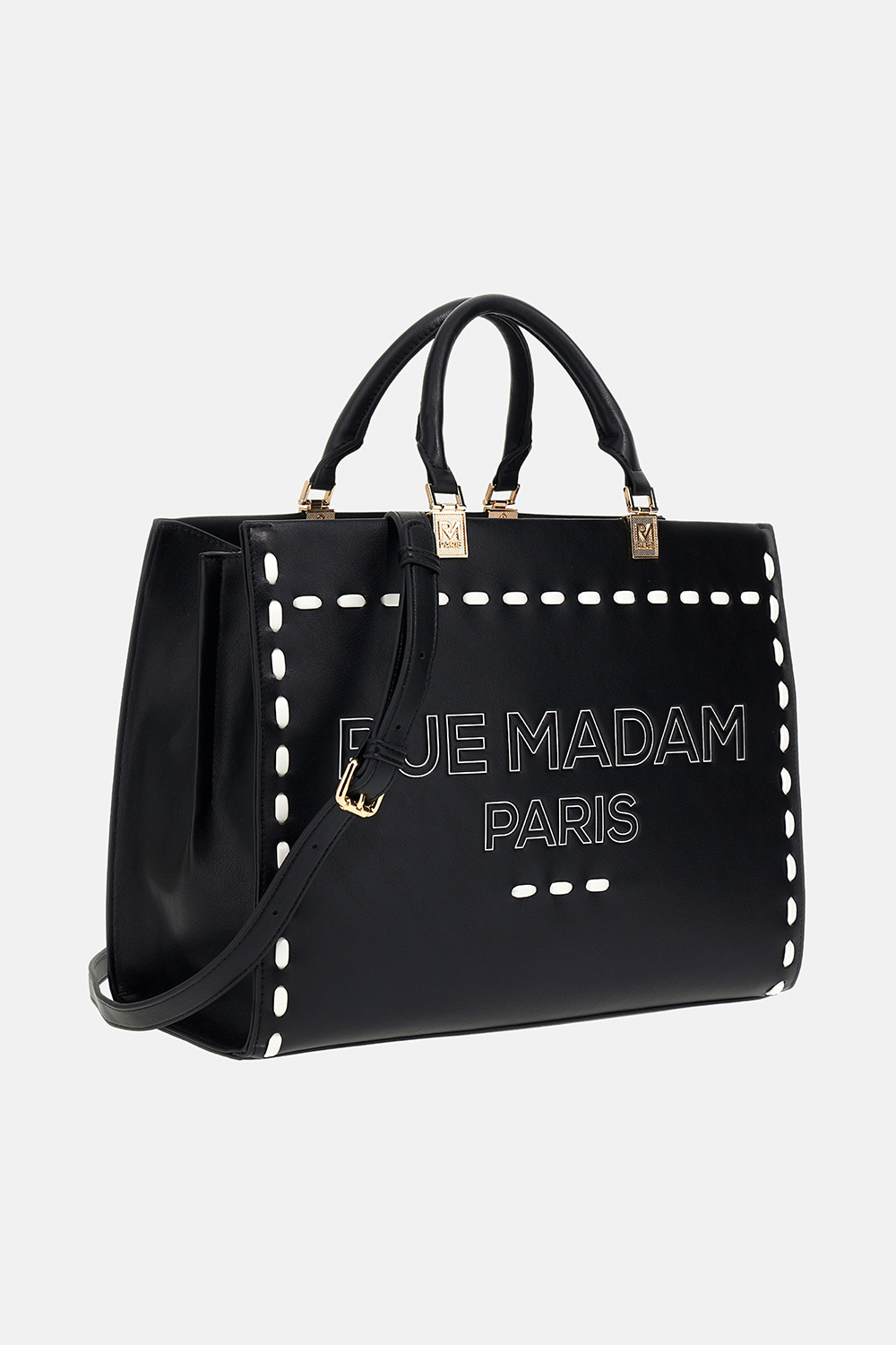 Smooth faux leather tote bag with a sleek, modern design, featuring an embossed and printed logo and contrasting topstitching for added character. Equipped with faux leather handles with branded gold-finish metallic details and a double shoulder strap for versatile carrying options. The interior includes a central zippered pocket in faux leather and a cotton lining with an inner pocket for added organization. Dimensions: W 35 cm × H 27 cm × D 15 cm