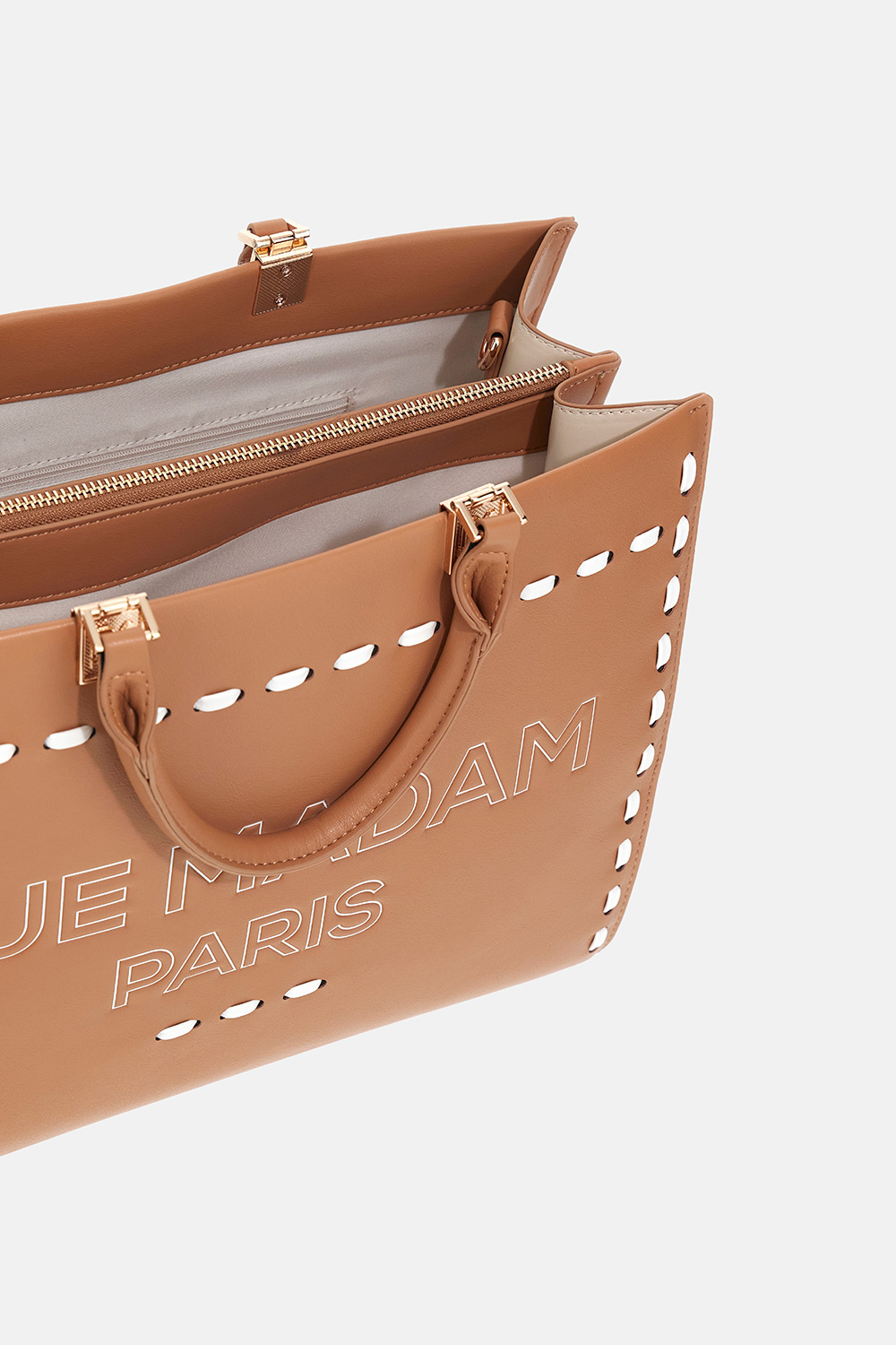 Smooth faux leather tote bag with a sleek, modern design, featuring an embossed and printed logo and contrasting topstitching for added character. Equipped with faux leather handles with branded gold-finish metallic details and a double shoulder strap for versatile carrying options. The interior includes a central zippered pocket in faux leather and a cotton lining with an inner pocket for added organization. Dimensions: W 35 cm × H 27 cm × D 15 cm