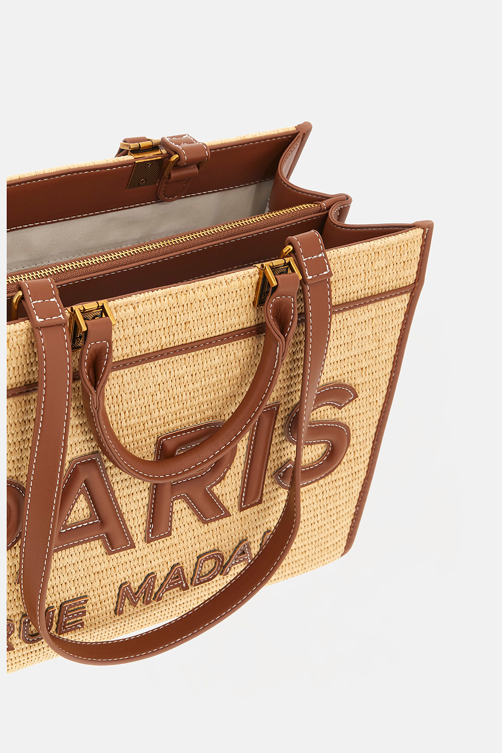 Straw tote bag with faux leather sides and details, featuring a padded PARIS logo with contrast stitching, faux leather handles with aged gold-tone logo metal accents, double shoulder strap, central faux leather zip pocket, and cotton-lined interior with pocket. Dimensions: L 35 cm × H 27 cm × D 15 cm.