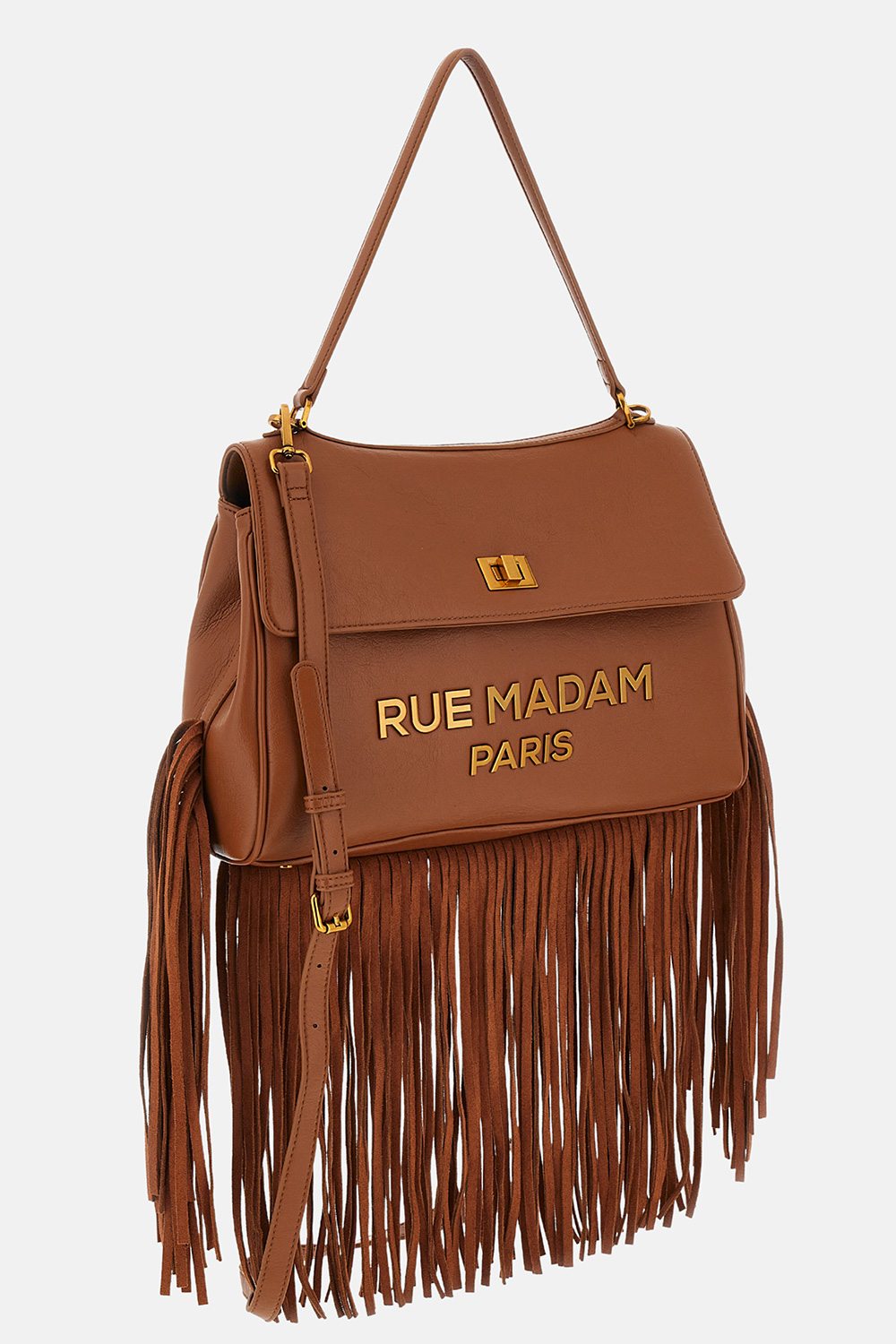 Large shoulder bag in soft faux leather, featuring a sophisticated and timeless design. Embellished with suede fringesthat add movement and character, and a vintage-effect metal logo with twist-lock closure for a refined finish. Equipped with a handle and removable shoulder strap for versatile wear, it includes a central compartment and a cotton lining with inner pocket to keep your essentials organized. Dimensions: W 36 cm × H 25 cm × D 12 cm