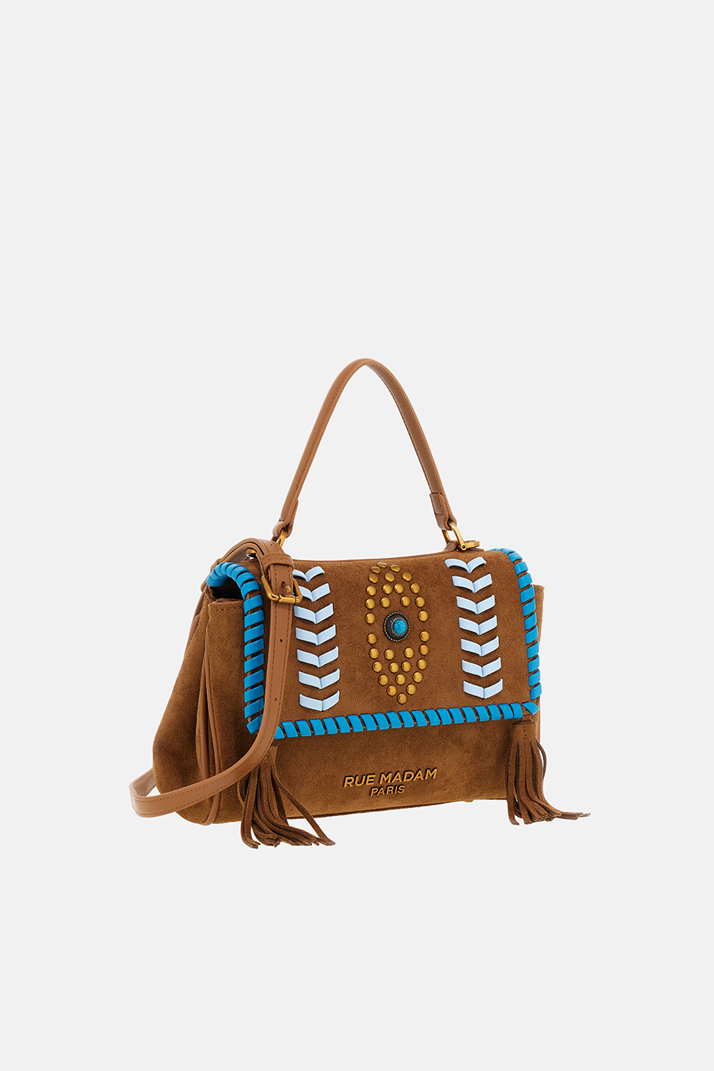 Small shoulder bag in soft faux suede, featuring a timeless and sophisticated design, embellished with decorative topstitching and ethnic-style studs that highlight its character. Accented with a gold-tone metal logo and suede tassels, it adds a refined and distinctive touch. Equipped with a handle and removable shoulder strap for versatile wear, it includes a central compartment and a cotton-lined interior with pocket for practical organization of personal items. Dimensions: W 26 cm × H 19 cm × D 10 cm