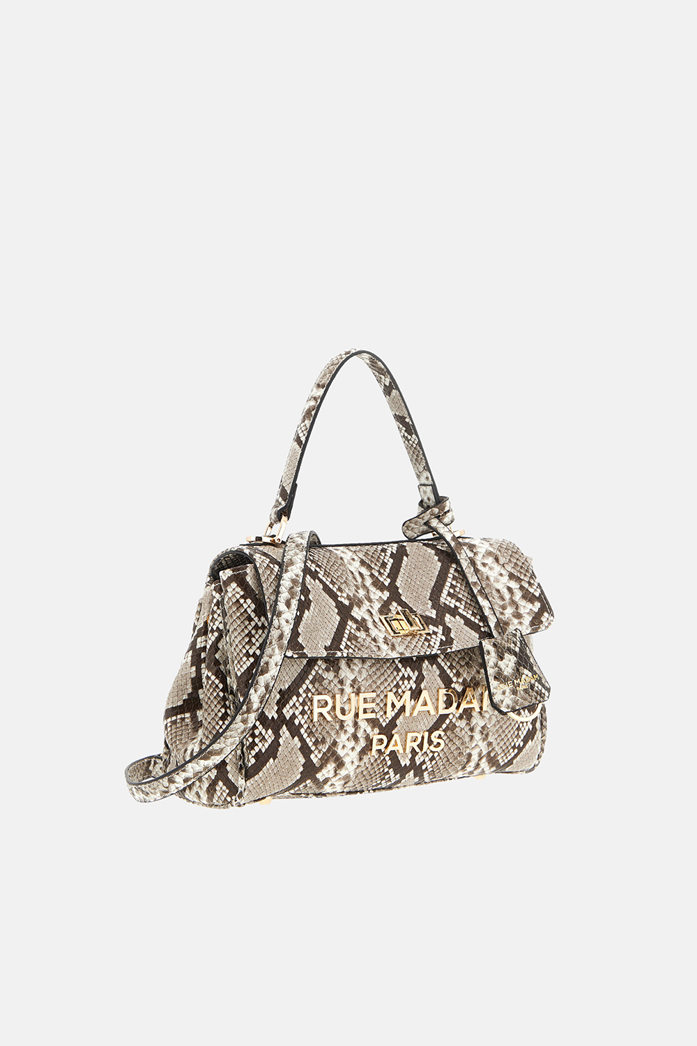 Small shoulder bag in soft faux leather with exotic python print, featuring a sophisticated and timeless design. Embellished with a gold-finish metal logo and a twist-lock closure that enhances its refined style. Equipped with a handle and removable shoulder strap for versatile wear, it includes a central compartment and a cotton lining with inner pocket for practical organization of personal items. Dimensions: W 26 cm × H 19 cm × D 10 cm