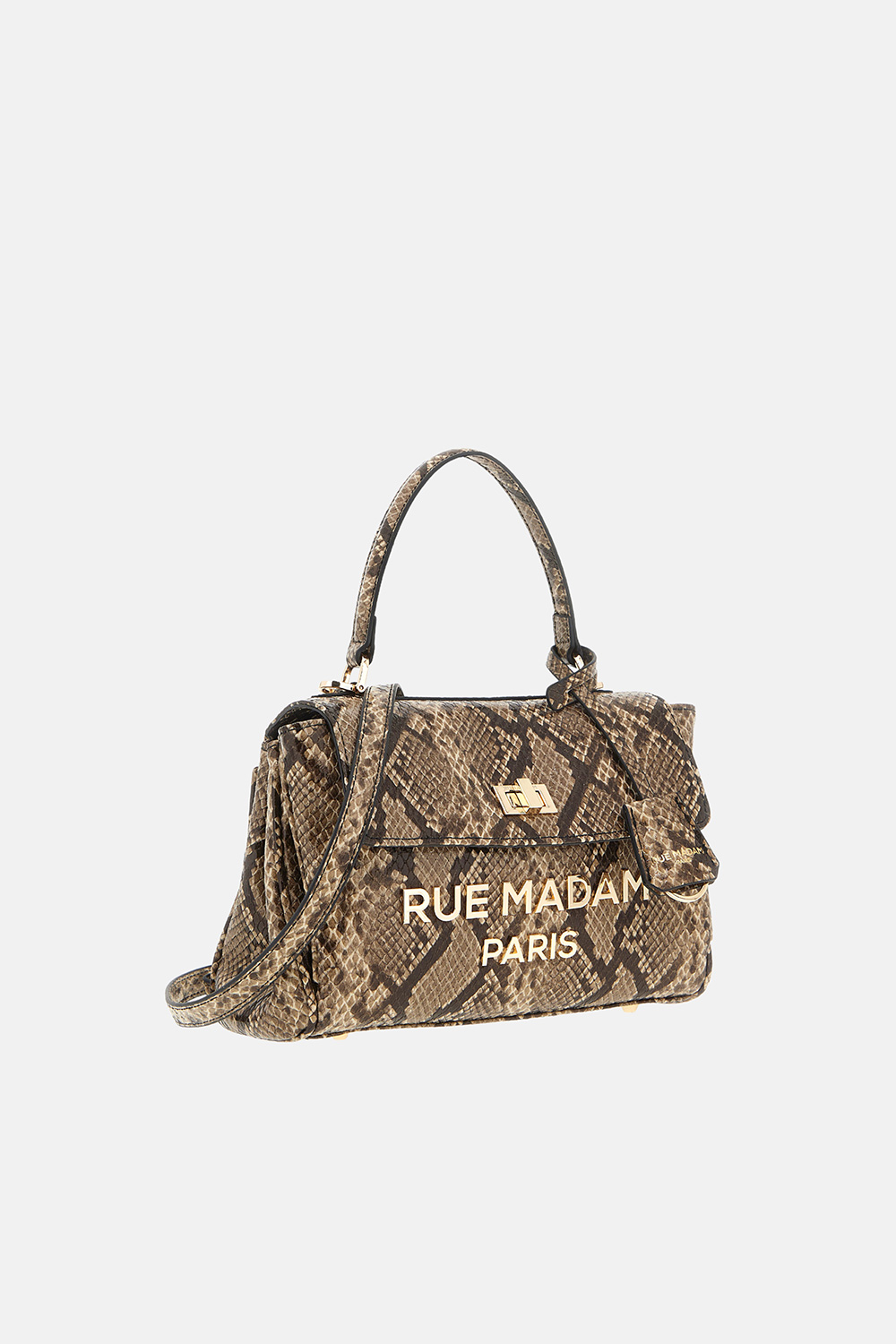 Small shoulder bag in soft faux leather with exotic python print, featuring a sophisticated and timeless design. Embellished with a gold-finish metal logo and a twist-lock closure that enhances its refined style. Equipped with a handle and removable shoulder strap for versatile wear, it includes a central compartment and a cotton lining with inner pocket for practical organization of personal items. Dimensions: W 26 cm × H 19 cm × D 10 cm