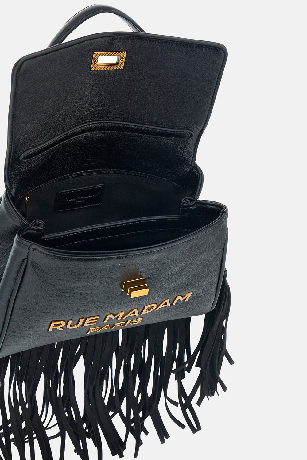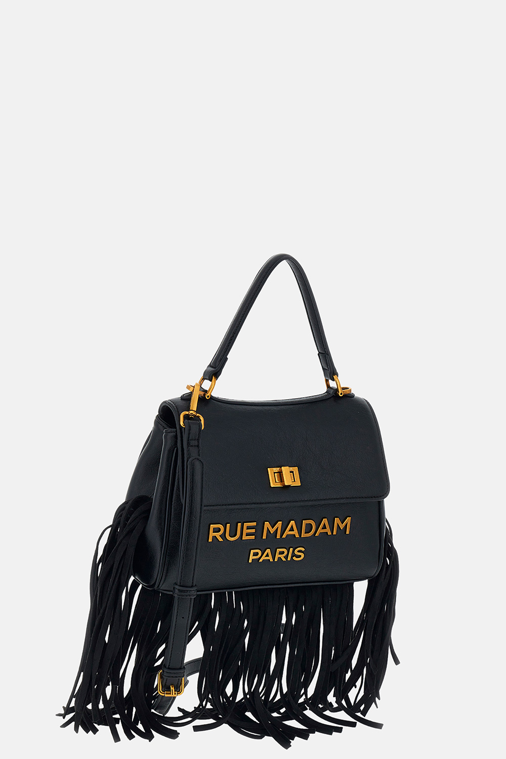 Small shoulder bag in soft faux leather, featuring a sophisticated and timeless design. Embellished with suede fringes that add movement and character, and a vintage-effect metal logo with twist-lock closure for a refined finish. Equipped with a handle and removable shoulder strap for versatile wear, it includes a central compartment and a cotton lining with inner pocket to keep your essentials organized. Dimensions: W 26 cm × H 19 cm × D 10 cm