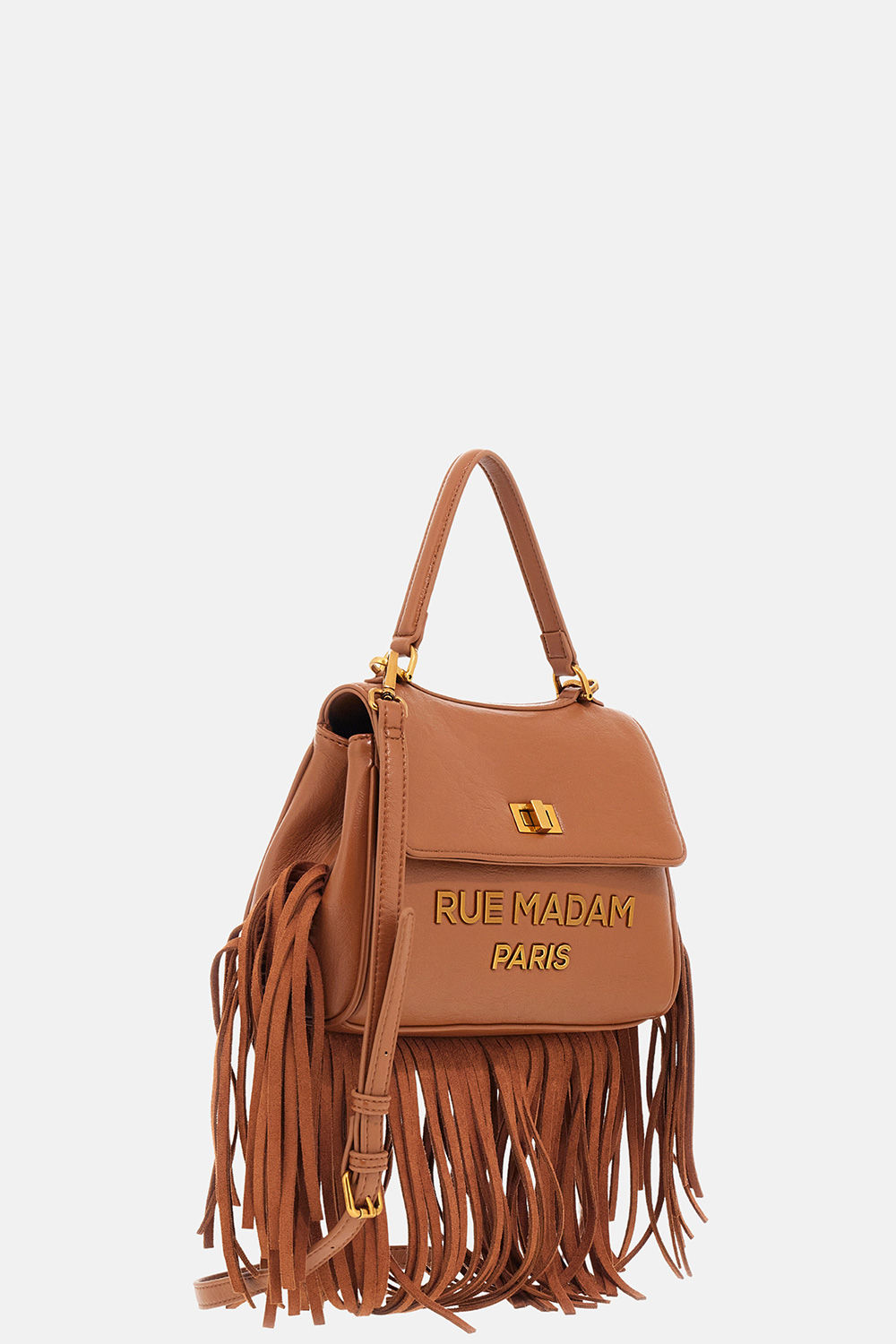 Small shoulder bag in soft faux leather, featuring a sophisticated and timeless design. Embellished with suede fringes that add movement and character, and a vintage-effect metal logo with twist-lock closure for a refined finish. Equipped with a handle and removable shoulder strap for versatile wear, it includes a central compartment and a cotton lining with inner pocket to keep your essentials organized. Dimensions: W 26 cm × H 19 cm × D 10 cm