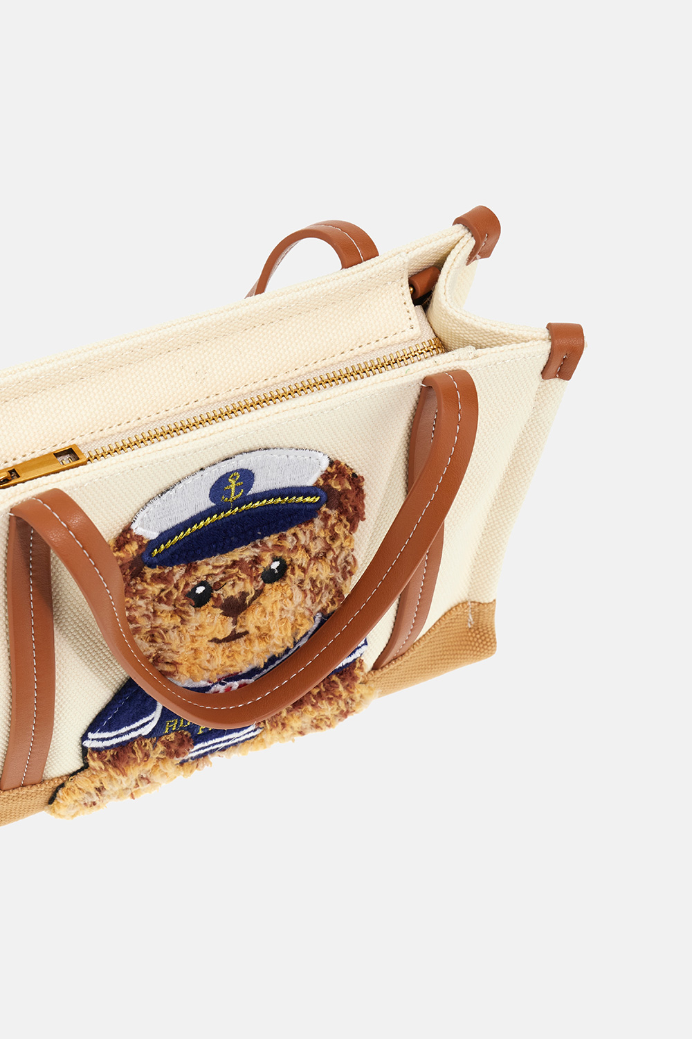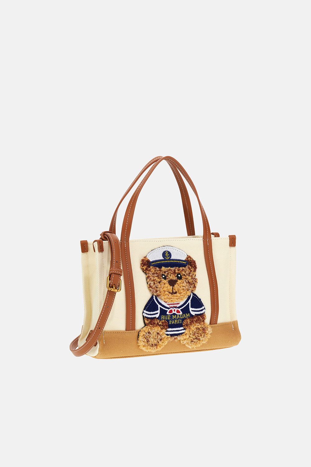 Mini soft shopping bag in canvas with a playful and contemporary design, enriched with the new plush-effect embroidery of the Sailor Marvin teddy bear, adding an original and affectionate touch. The contrasting base, combined with the faux leather handles and details, enhances the structure with elegance. Zip closure and cotton-lined interior with pocket, ideal for practical daily organization. Dimensions L 27 x H 20 x W 10 cm