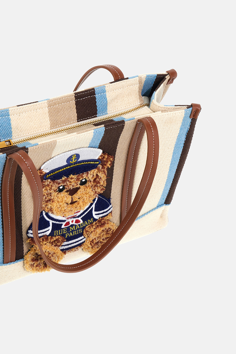 Shopping bag morbida in canvas, dal design giocoso e contemporaneo, arricchita dal nuovo ricamo effetto peluche dell'orsetto Sailor Marvin, che dona un tocco originale e affettuoso. Il fondo a contrasto, insieme ai manici e dettagli in ecopelle, valorizza la struttura con eleganza. Chiusura con zip e fodera interna in cotone con tasca, ideale per una pratica organizzazione quotidiana. Dimensioni L 36 x H 27 x P 15 cm