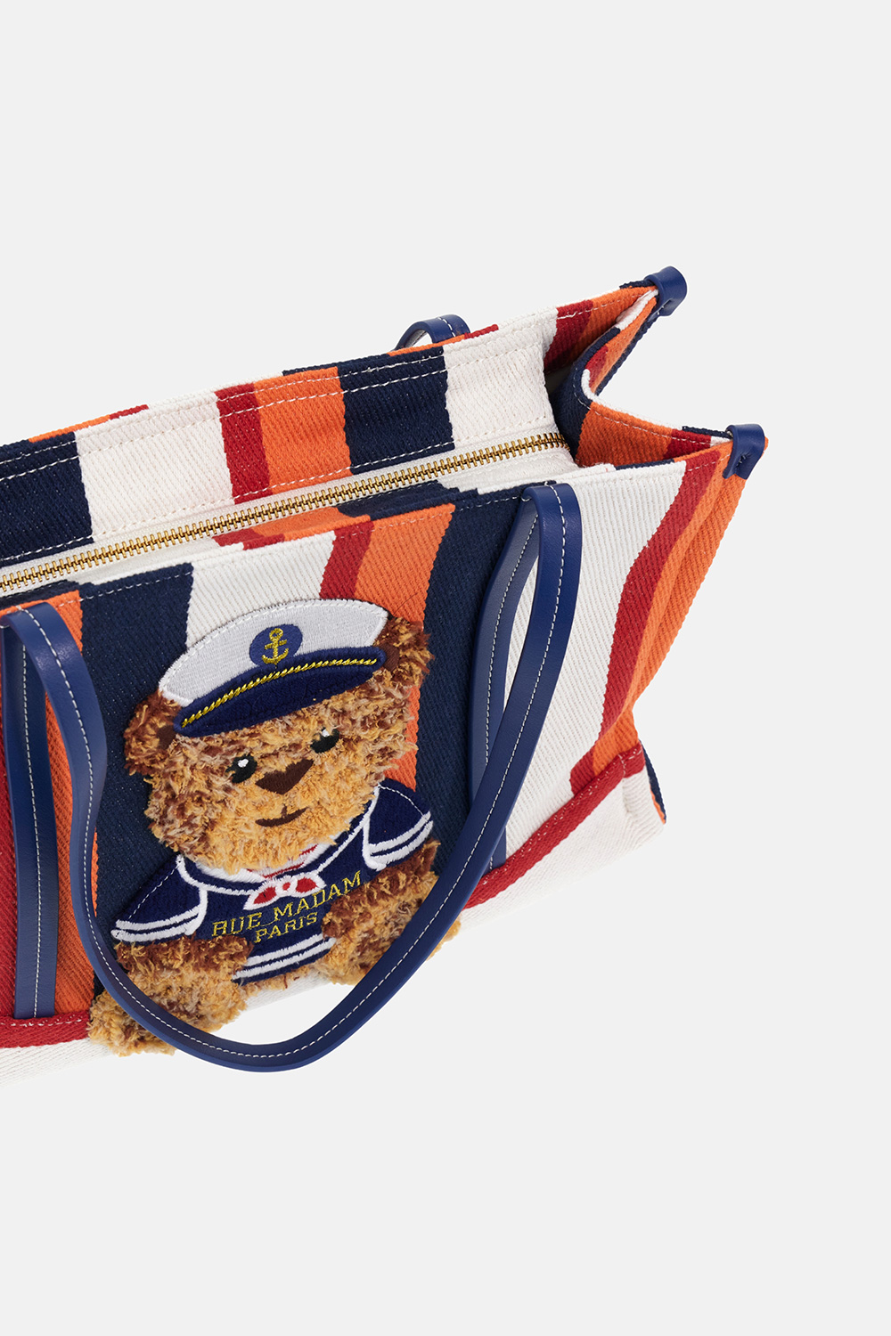 Shopping bag morbida in canvas, dal design giocoso e contemporaneo, arricchita dal nuovo ricamo effetto peluche dell'orsetto Sailor Marvin, che dona un tocco originale e affettuoso. Il fondo a contrasto, insieme ai manici e dettagli in ecopelle, valorizza la struttura con eleganza. Chiusura con zip e fodera interna in cotone con tasca, ideale per una pratica organizzazione quotidiana. Dimensioni L 36 x H 27 x P 15 cm