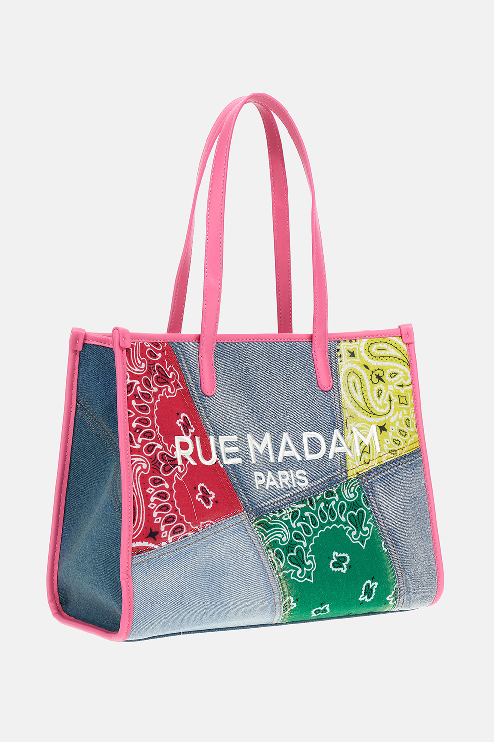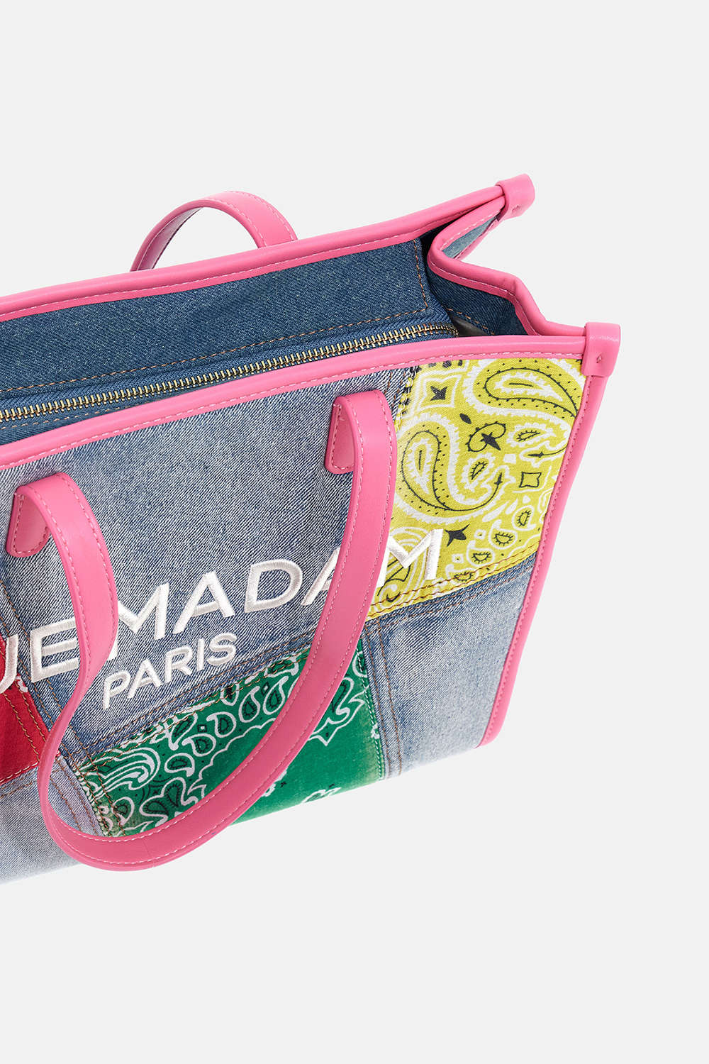 Soft denim patchwork shopping bag with a bold, casual attitude, enriched with unique bandana print details and a 3D embroidered logo for an urban and distinctive flair. Faux leather handles and trims add a touch of elegance to the design. Zip closure. The cotton-lined interior with pocket ensures functionality and everyday style. Dimensions L 35 x H 28 x W 15 cm