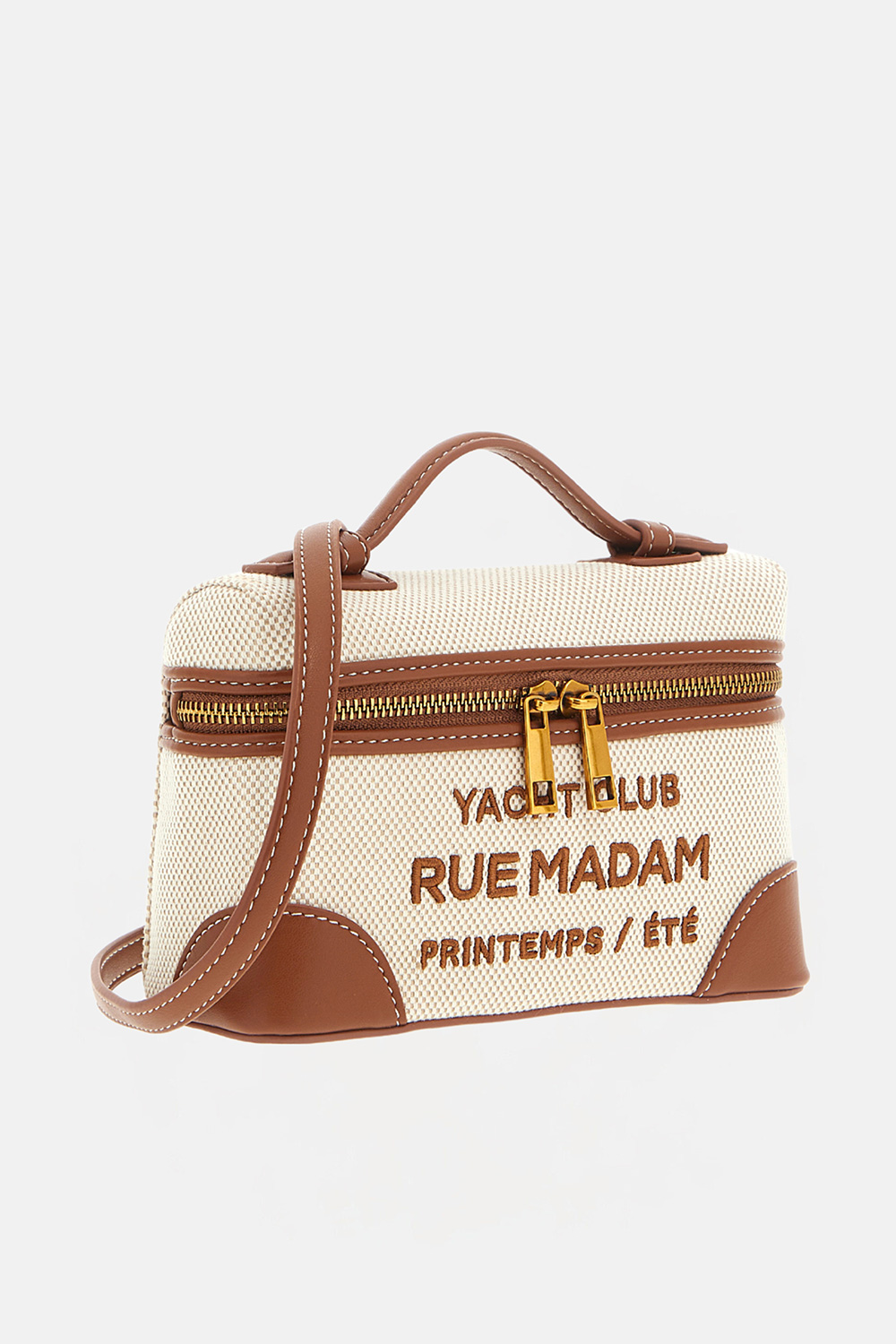 Compact and feminine canvas crossbody bag, enhanced with eco-leather trims and contrast stitching that highlight its refined and polished style. The piece features the "YACHT CLUB" embroidery for a distinctive and modern touch. Equipped with a zip closure and a thin, removable strap, it's perfect to wear as a lightweight and versatile bag for everyday outings. Dimensions L 25 x H 15 x W 7 cm