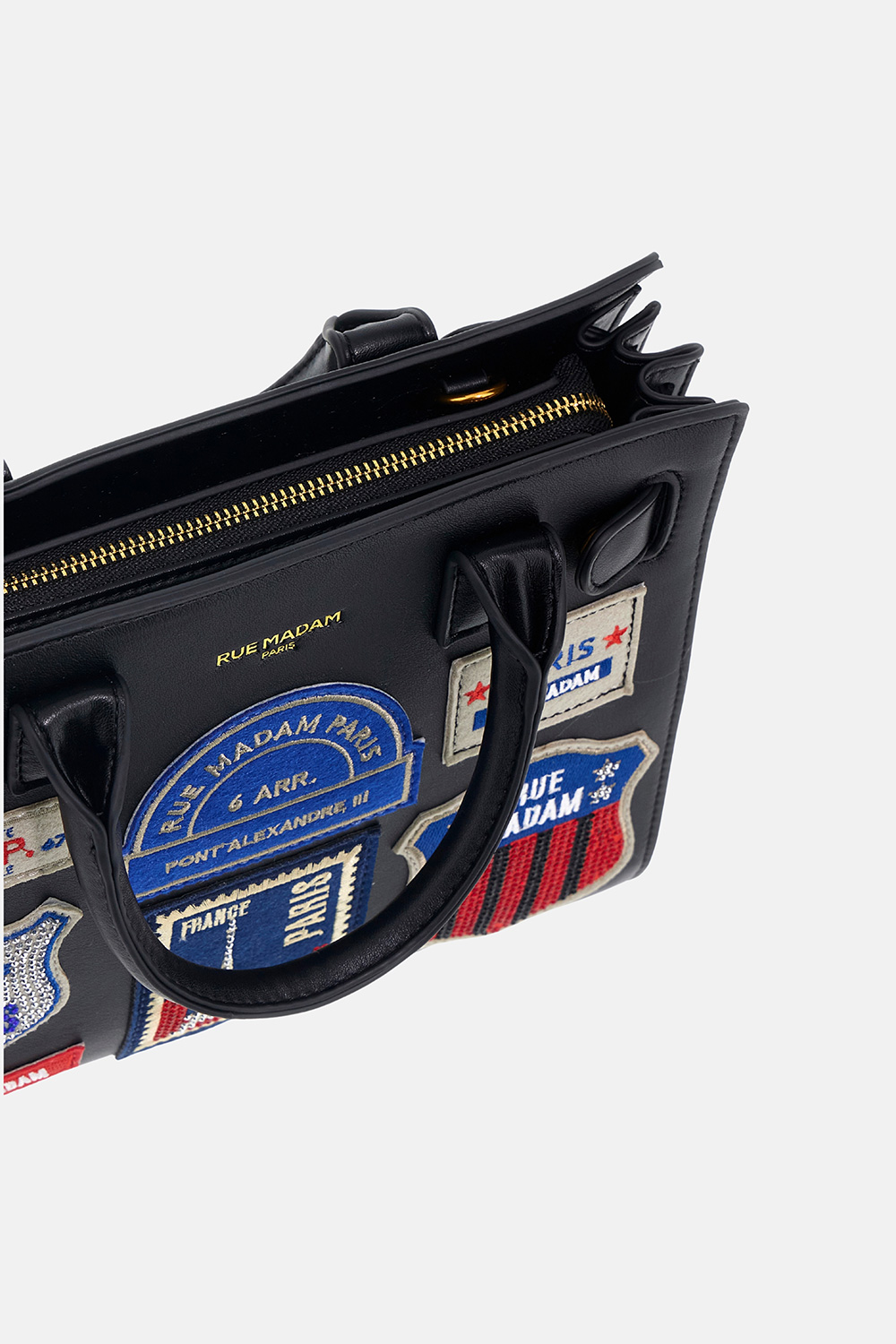 Smooth faux leather tote bag with a bold and contemporary look, embellished with custom embroidered patches adorned with rhinestones for a touch of sparkle and personality. The gold-printed logo adds a refined finishing touch. Designed with side gussets for added structure, a zip closure, and a removable shoulder strap for versatile styling. The interior features a cotton lining with leopard print and an inner pocket to keep your essentials organized. Dimensions L 36 x H 25 x W 16.5 cm