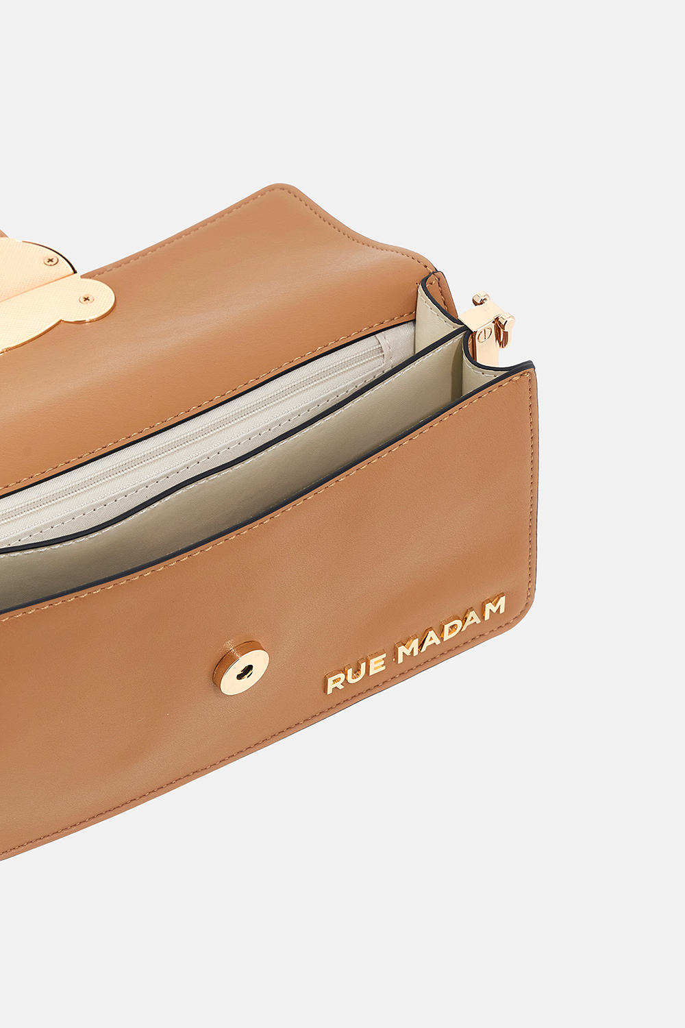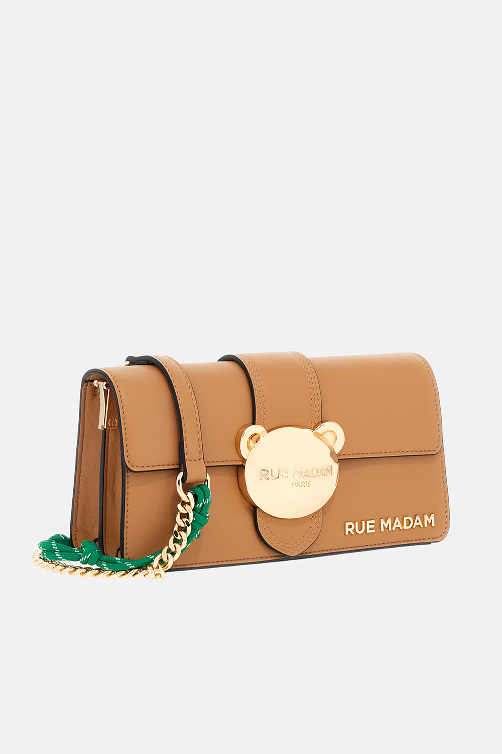 Crossbody bag in soft faux leather with a modern and feminine design, embellished with our iconic gold-finish teddy bear-shaped buckle, a distinctive brand symbol. Features a removable and adjustable shoulder strap, enriched with a unique colored rope detail and chain, for a refined and versatile look. The interior is divided into two compartments, lined in cotton and equipped with inner pockets to keep your essentials organized. Dimensions L 24 x H 13 x W 7 cm