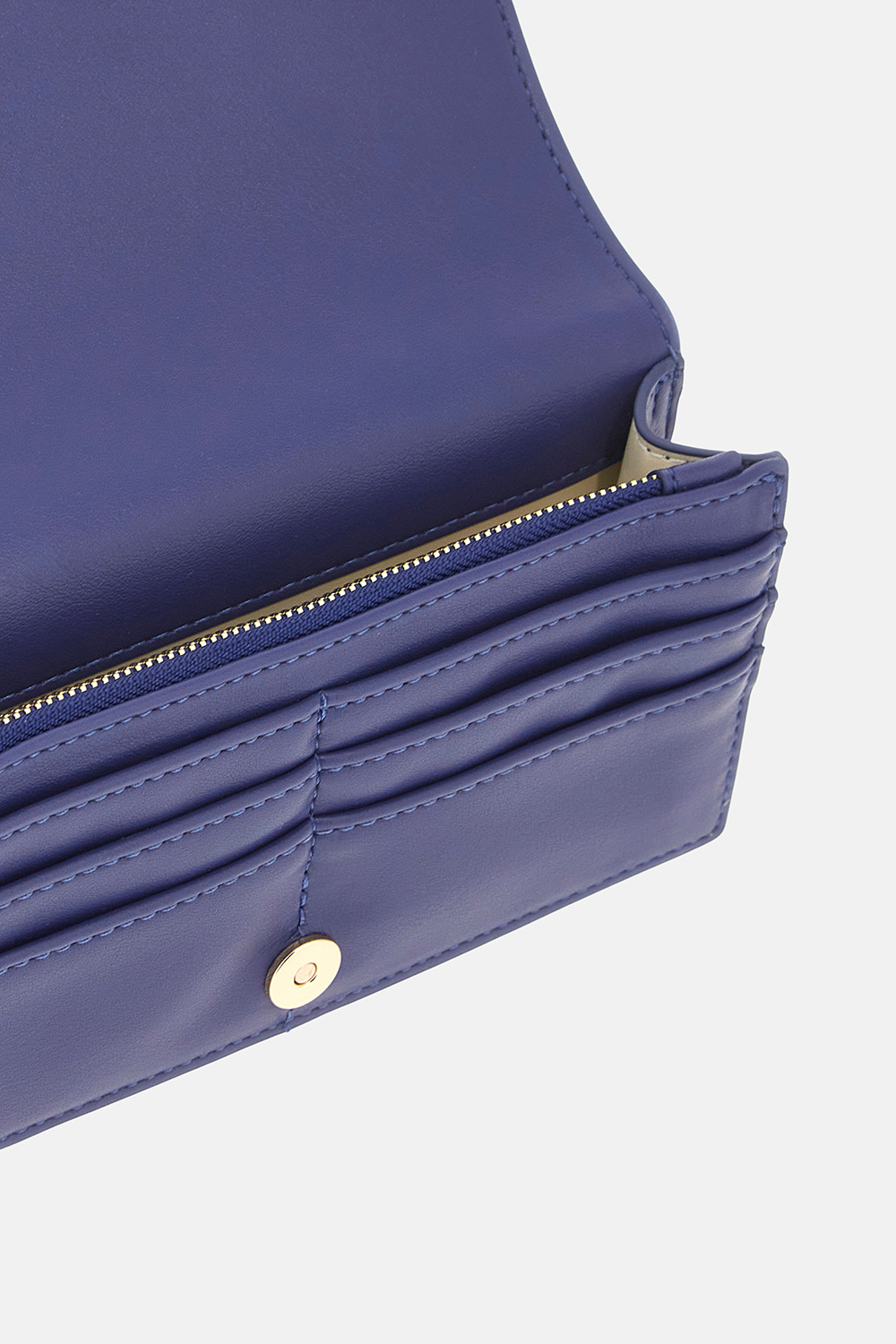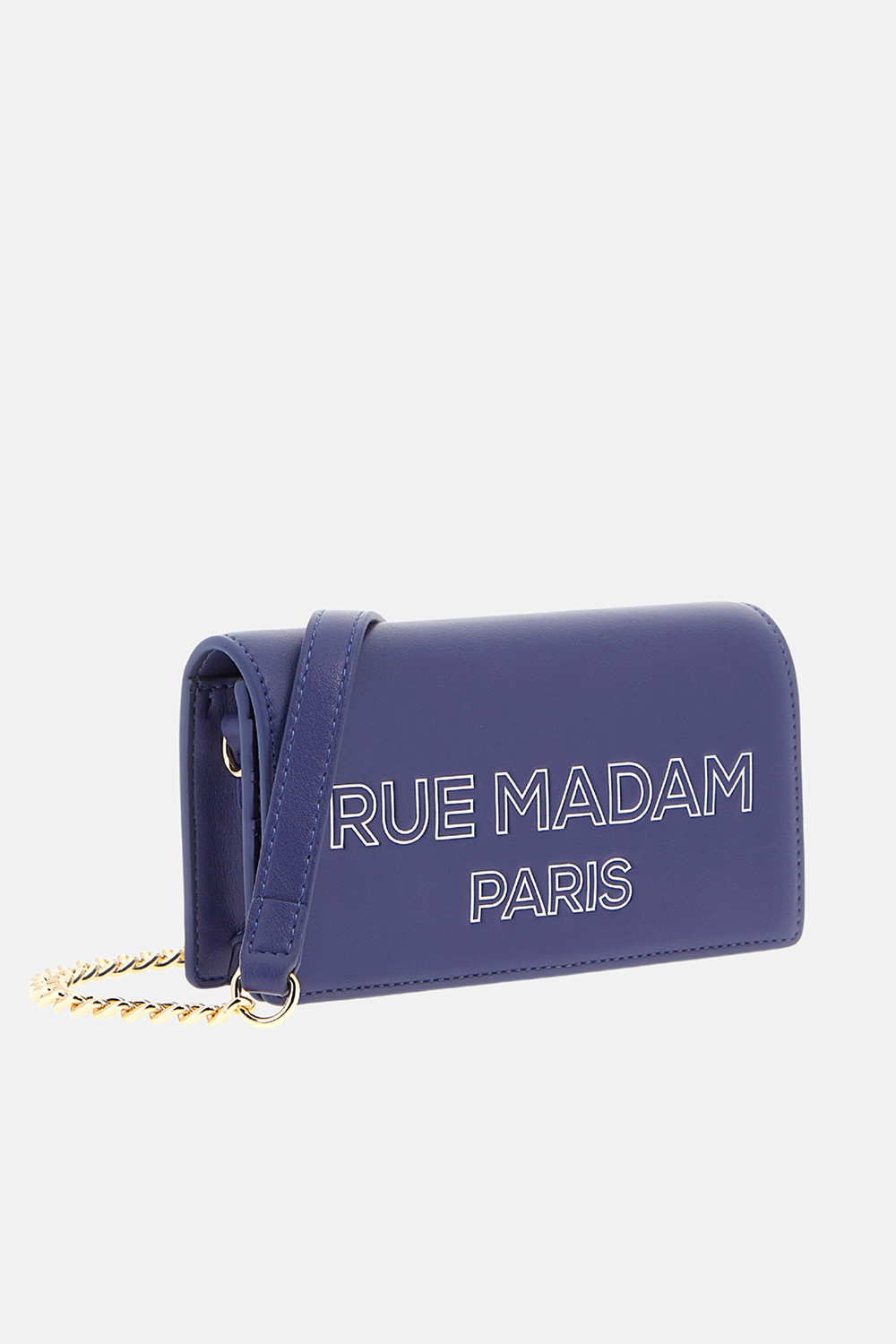 Vegan faux leather smartphone crossbody bag, compact and functional, featuring an embossed and printed logo for a distinctive touch. The interior is designed with dedicated spaces for cards and coins, making it perfect for carrying essentials. Equipped with a removable chain shoulder strap for versatile wear and a cotton lining with inner pocketfor added organization. Dimensions: W 19 cm × H 10 cm × D 5 cm
